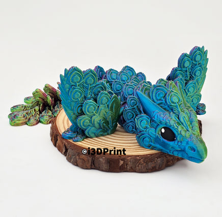 This stunning 3D printed articulated dragon is inspired by the vibrant colours and graceful beauty of a peacock. With its flowing tail, detailed feather-like scales, and smooth jointed movement, the Peacock Dragon makes a dazzling addition to any collection.
